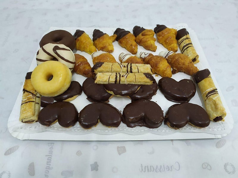 10 croissant – 10 palmeras fondant – 3 donuts – 5 flautas de chocolate